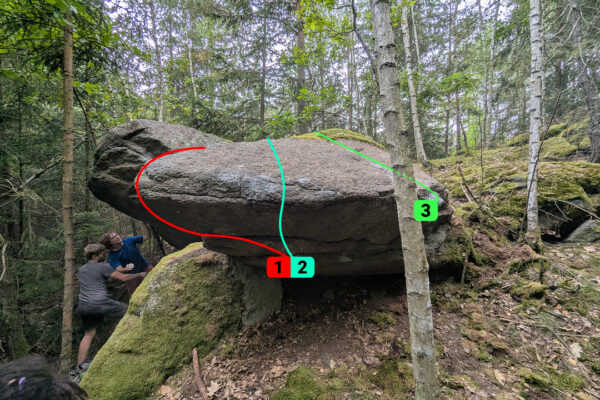 Severovýchodní Kóta je první ze 3. sektorů na Kozích hřbetech. Dobře přístupný, zamešený ale s občasným hezkým bouldrem.