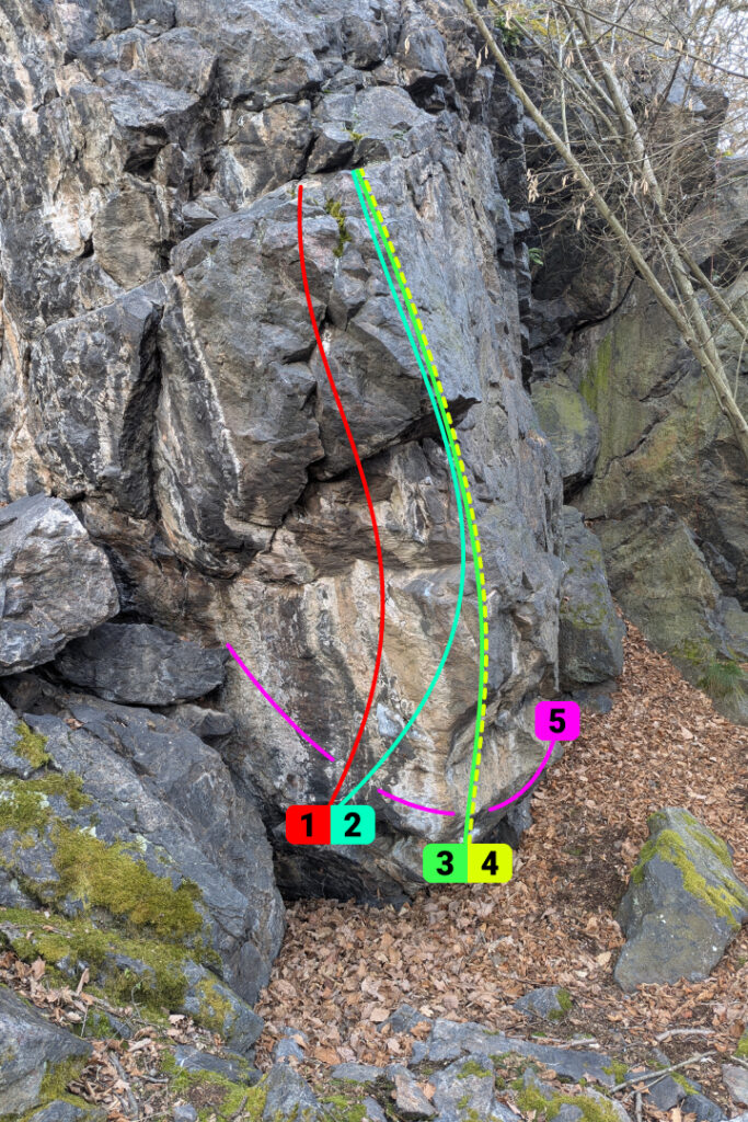 Poslední linie této části skály je také nejlehčí linií sektoru. Vede napravo od cesty č.5, po členitější části skály.