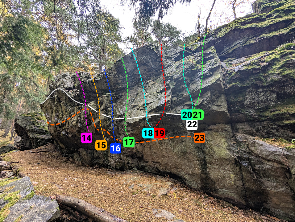 Oranžový okruh je linie spojující boulder problémy obtížností V3-V4 v Divoké Šárce. Vybrali jsme 10 sektorů a jejich nejlepší cesty.